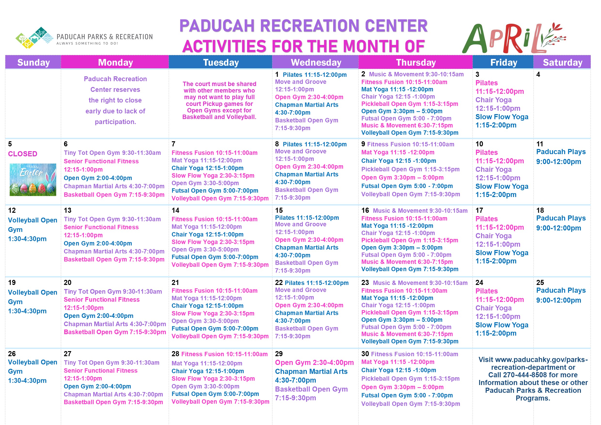 - Paducah parks & Recreation is not responsible for lost or stolen items.
