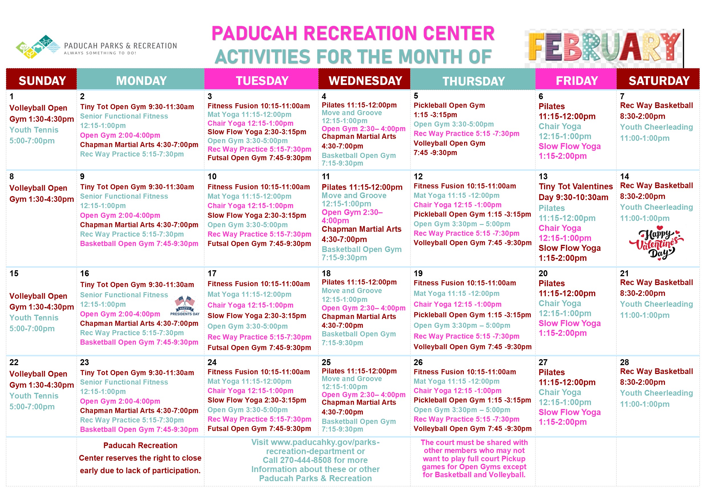 The Paducah Recreation Center is available for reservations for birthday parties and athletic/fitness activities only.